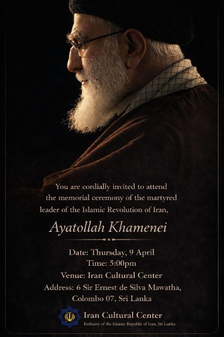 The Embassy of the Islamic Republic of Iran announces that a memorial ceremony to commemorate the martyrdom of Ayatollah Ali Khamenei will be held at the Iran Cultural Center in Colombo.