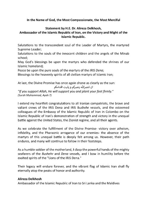 Statement by H.E. Dr. Alireza Delkhosh, Ambassador of the Islamic Republic of Iran, on the Victory and Might of the Islamic .Republic