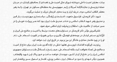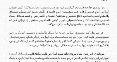 ایران هرگز در پی جنگ نبوده است. ایرانیان ملتی صلحطلب و شریفاند که وارث یکی از غنیترین تمدنهای جهان هستند. با این حال، آنها عزم و ارادهای کامل و خللناپذیر برای دفاع از خود در برابر متجاوزان بیرحمیکه در ارتکاب انواع جنایات هیچ حد و مرزی نمیشناسند، نشان دادهاند؛ دفاعی که تا هر زمان که لازم باشد ادامه خواهد یافت.