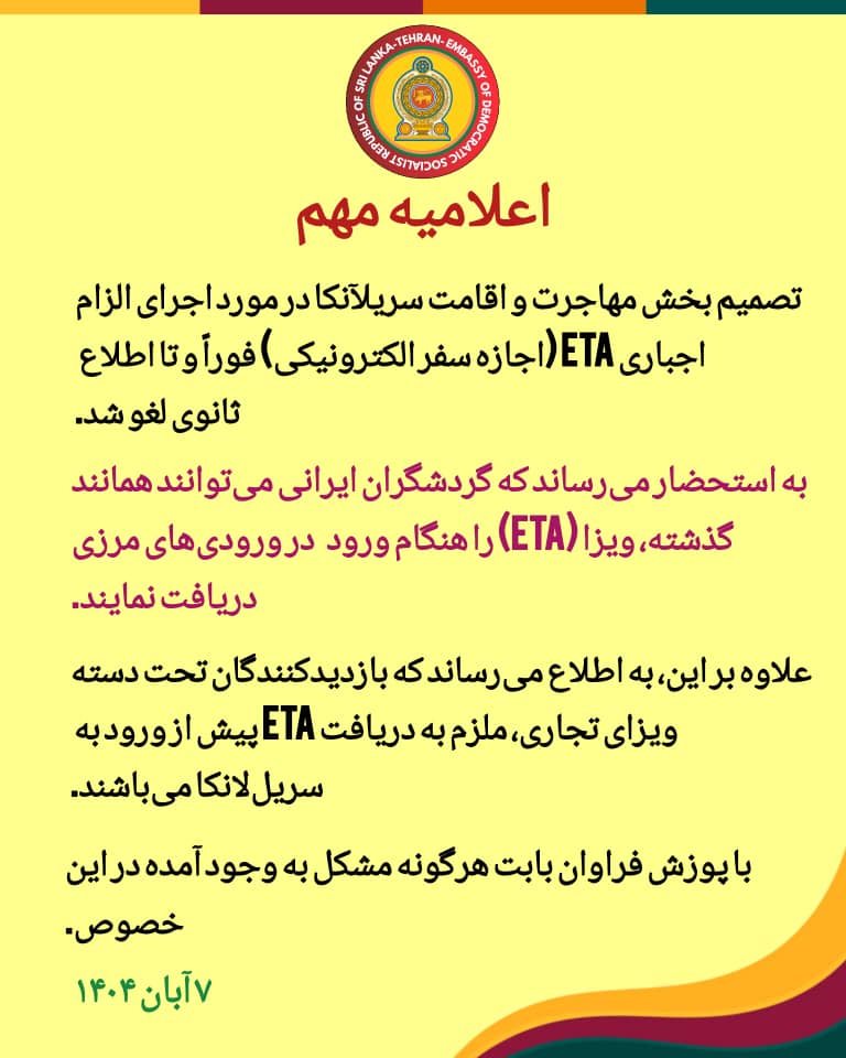 اطلاعیه مهم سفارت محترم سریلانکا در جمهوری اسلامی ایران