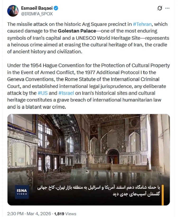 اسماعیل بقائی سخنگوی وزارت امور خارجه با بازنشر فیلم بازدید سید رضا صالحی امیری، وزیر میراث فرهنگی، گردشگری وصنایع دستی از کاخ گلستان که درحمله موشکی متجاوزان آمریکایی وصهیونیستی خسارات جدی بدان وارد شده، درپیامی درشبکه ایکس نوشت: